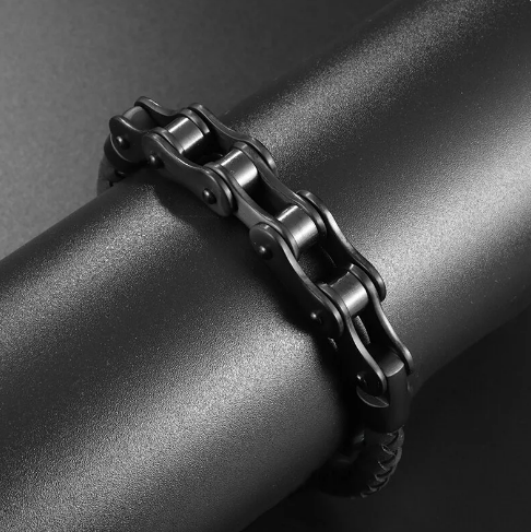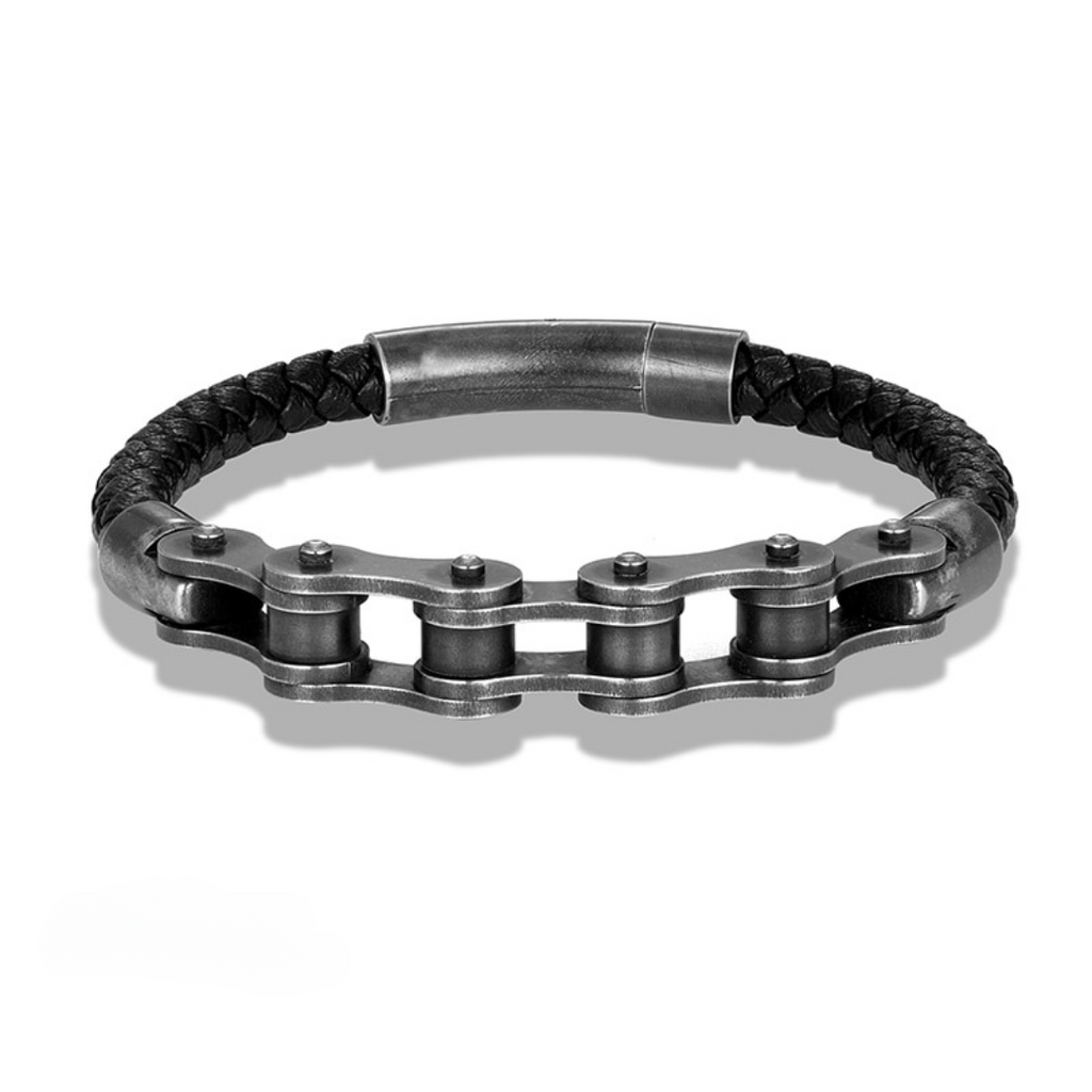 Para você que curte rodar de moto, a pulseira é confeccionada em liga de zinco e couro trançado, com abotoadura de engate rápido. Seu design arrojado em corrente de deixa o modelo ainda mais atraente. Um acessório cheio de estilo para os amantes do motociclismo, bikes e do rock in roll.